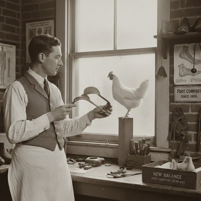 У 1906 році в Бостоні 33-річний англійський емігрант Вільям Дж. Райлі заснував компанію New Balance Arch Support Company. Створивши спеціалізовану лабораторію, він розробив унікальний гнучкий супінатор із трьома точками опори, ідею якого запозичив у курки, що ідеально тримає рівновагу. Його винаходи були спрямовані на підтримку стопи та полегшення болю при ходьбі для людей з анатомічними проблемами. |