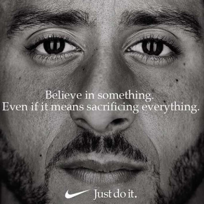 У 2018 році Nike випустила одну з найсуперечливіших і найпотужніших рекламних кампаній до 30-річчя слогану «Just Do It». Головним обличчям став Колін Капернік — гравець NFL, який став символом боротьби проти расової несправедливості, ставши на коліно під час гімну США. Слоган кампанії: «Believe in something. Even if it means sacrificing everything» («Вір у щось. Навіть якщо це означає пожертвувати всім»). |