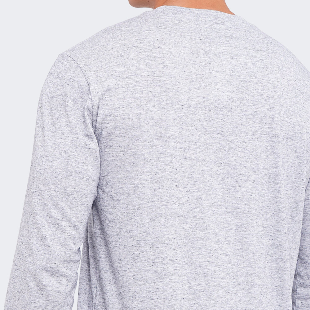 Чоловічий спортивний лонгслів меланжевого забарвлення. Виріб прямого крою із широкими манжетами на рукавах. Виготовлений із якісного трикотажу з високим вмістом бавовни. Спереду декорований невеликим принтованим логотипом бренду. Оптимально підійде для занять спортом, добре відводить вологу від тіла, швидко висихає. Лонгслів із зручним круглим вирізом горловини.