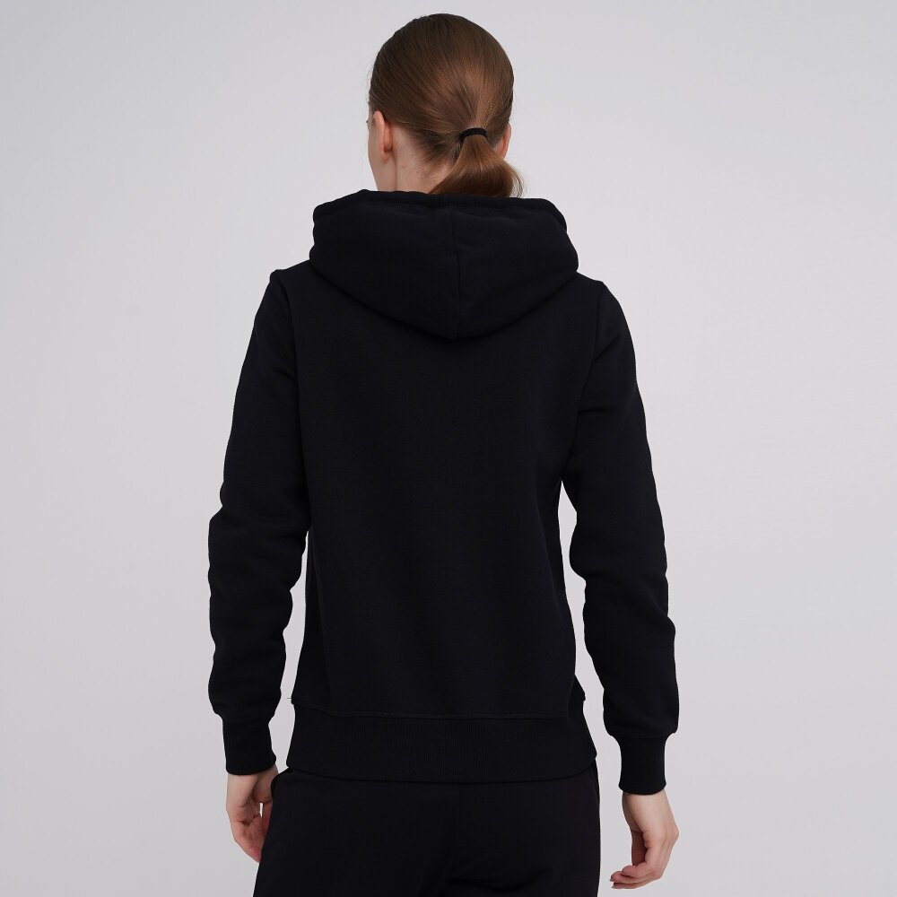 Комфортна та стильна модель жіночого худі, виготовленого із м'якої трикотажної тканини (бавовни - 80% та поліестеру - 20%). Еластичні манжети на рукавах та по низу виробу у рубчик. Толстовка декорована великим логотипом бренду на грудях та зручною кишенею-кенгуру. Зручності худі додає вшитий капюшон на кулісці.