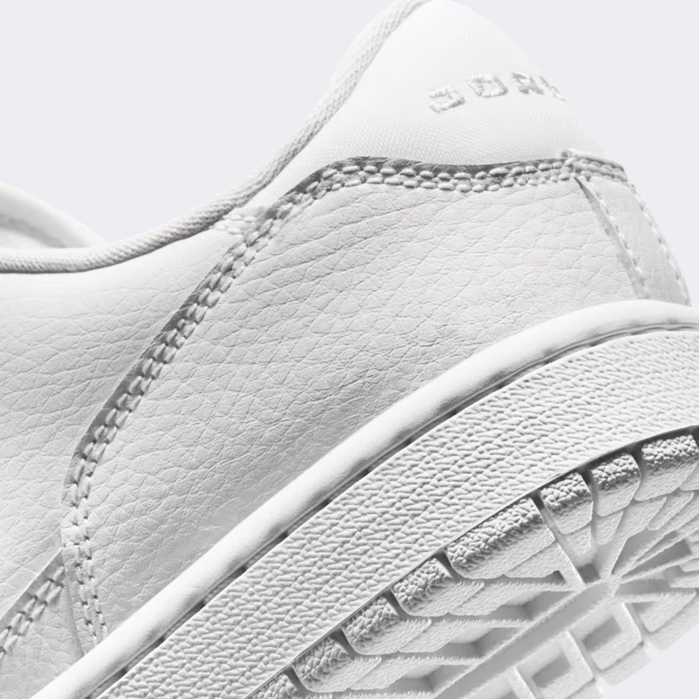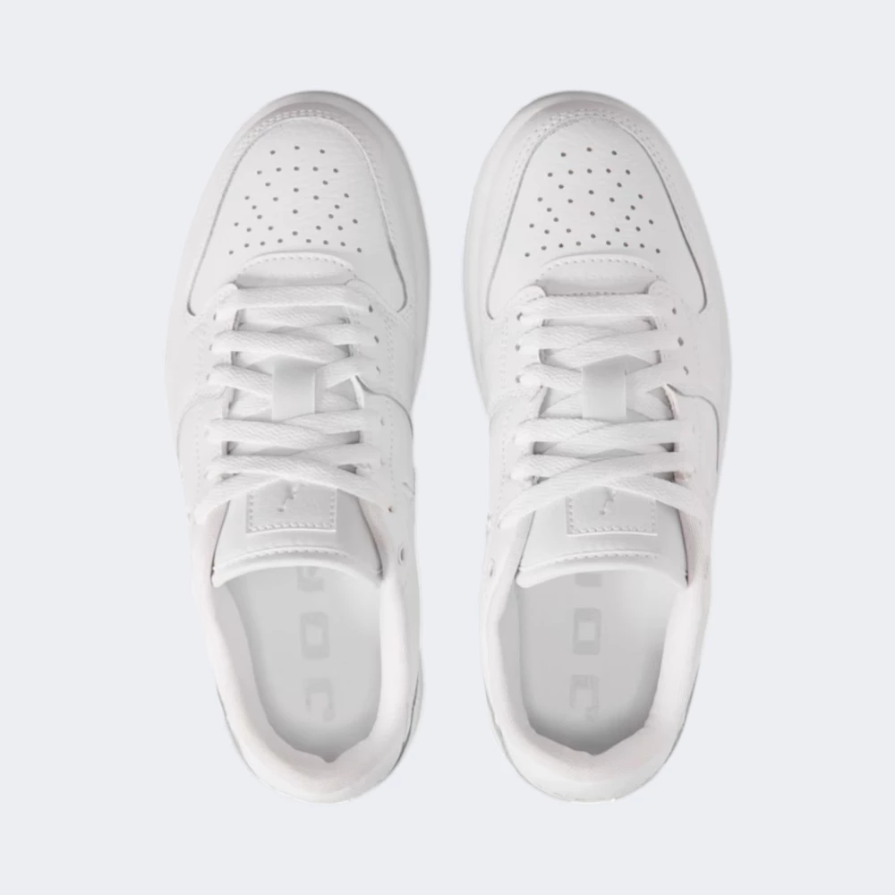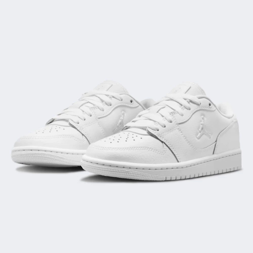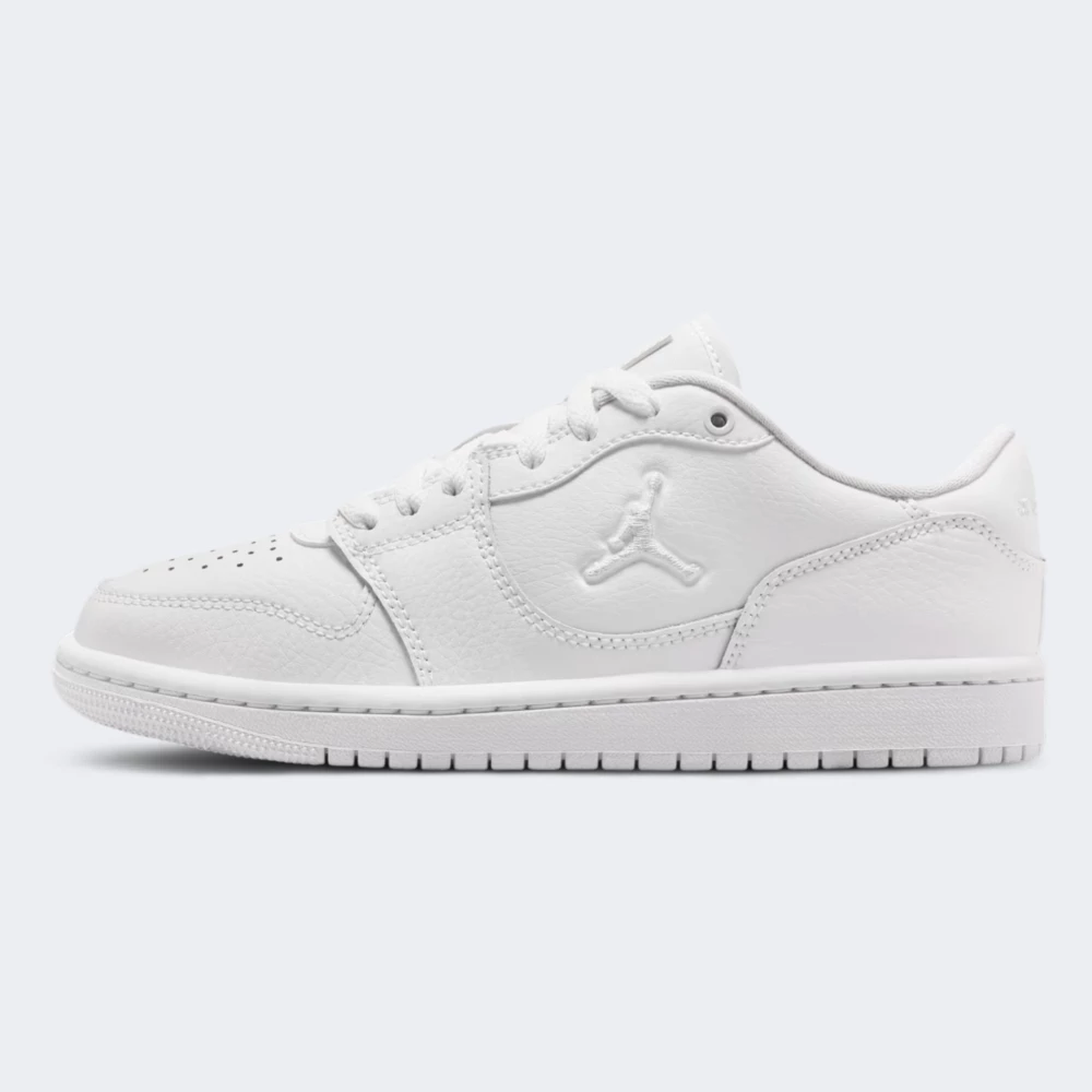 Jordan ACCESS COURT LOW (GS) кеди низького профілю з класичною центральною шнурівкою, рельєфним логотипом Jumpman на бічній панелі і перфорованою носковою частиною. Верх виконаний із комбінування натуральної гладкої шкіри та синтетичних вставок з текстильною внутрішньою підкладкою, усередині загладжені шви, м’який язичок оптимально лягає на підйом стопи. Плоска гумова підошва з боковим протекторним малюнком, середній шар містить тонку повітряну камеру і м’яку устілку, зовнішній шар має зносостійке гумове покриття в зонах контакту. Колір білий з невеликими світло-сірими металевими люверсами. Сезонність демісезон.