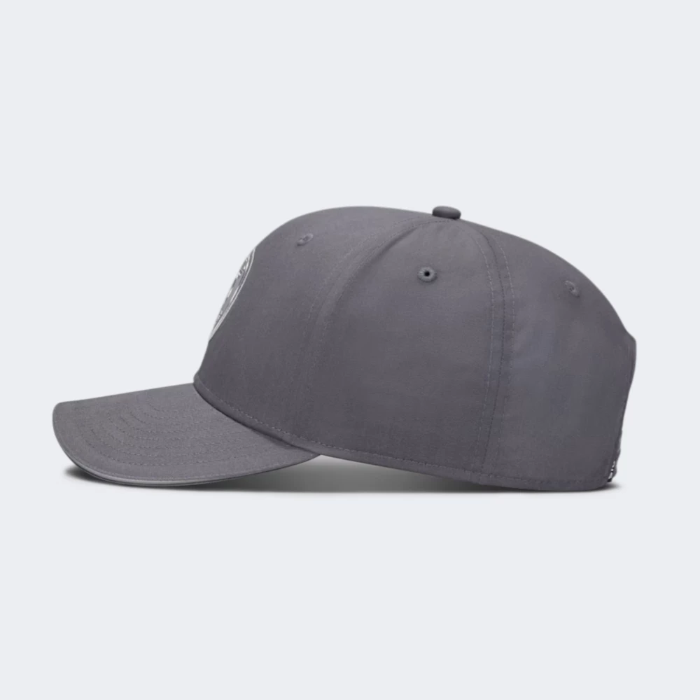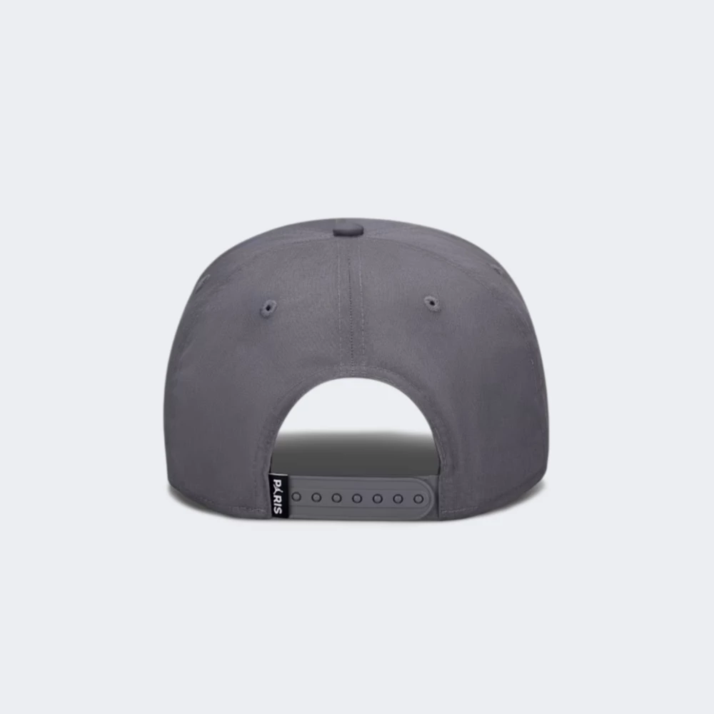 Jordan U J RISE CAP S CB – PSG це кепка класичної шестипанельної бейсболки з круглою тільдою і середнім козирком з підсиленою вставкою, з центральним білим круглим шевроном PSG на передній панелі, круглими отворами на верхніх панелях та кнопкою на вершині. Потилична частина оснащена регульованим ремінцем з пластиковою застібкою snapback, внутрішній ободок виконаний із тканинної стрічки. Колір корпусу середньо‑темно‑сірий, декоративні елементи і логотип білі, деталі підшивки та отвори темно‑сірі або чорні. Матеріали включають бавовну і нейлон, пластикову застібку і декоративний шеврон у вигляді вишивки або нашивки. Сезонність літо і демісезон.