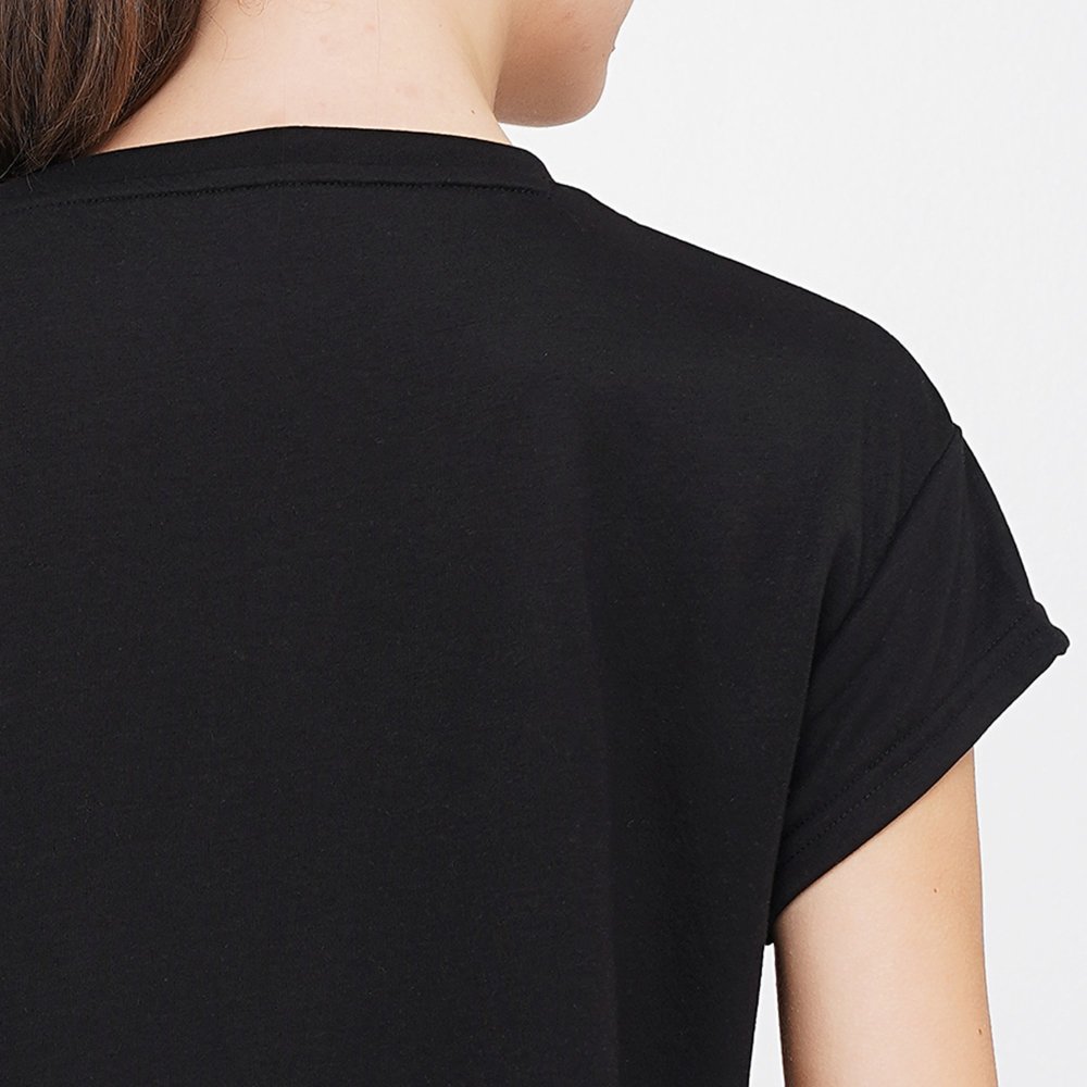 Футболка вільного крою, з контрастним принтом спереду. Низ спинки злегка занижений. Довжина виробу по спинці на розмір S: 65 см.
