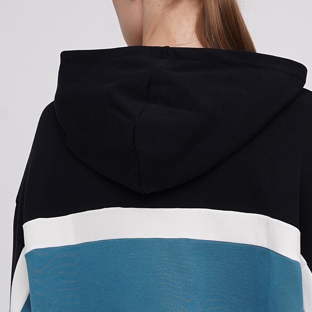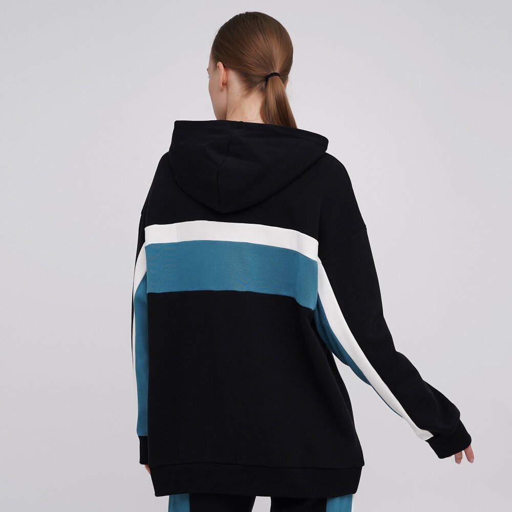 Бавовняний жіночий худі фасону оверсайз - ідеальний вибір для зручного та стильного образу. Занижена лінія плеча та великий витий капюшон додають кофті оригінальності. Додаткового шарму худі додають контрастні вставки на спині. Еластичні манжети на рукавах та по низу кофти забезпечують зручність посадки, а кишеня-кенгуру знадобиться для зберігання потрібних речей. Завершуючим штрихом виступає невеликий вишитий логотип бренду на грудях.