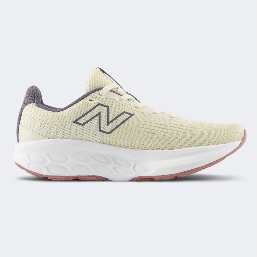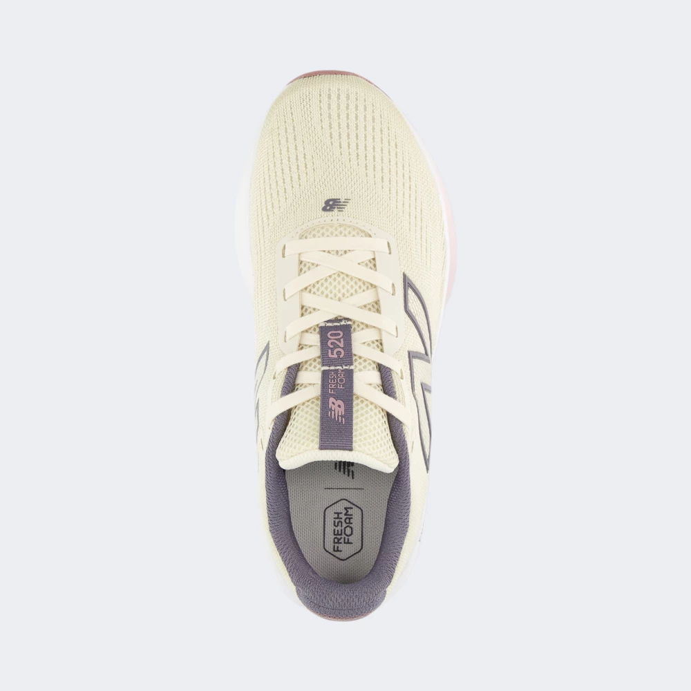 New Balance model 520 кросівки з низькопрофільним силуетом і дихаючим сітчастим верхом у бежевому тоні з синтетичними підсиленнями навколо логотипа та п'яткової зони, класична центральна шнурівка, м'який язичок і ущільнений комір для фіксації п'яти. Проміжна підошва зі спіненого матеріалу маркуванням Fresh Foam з хвилеподібною фактурою, біло‑рожевий бічний шар підошви і чорний гумовий протектор знизу, додаткові накладки в зоні носка та п'яти. Логотип N сірого‑графітового відтінку, шнурівка в бежево‑кремовому тоні. Верх текстильний з сітчастою структурою, підкладка і устілка з дихаючих матеріалів, підошва зі спіненого матеріалу і зносостійкої гумової підметки. Сезонність літо, демісезон