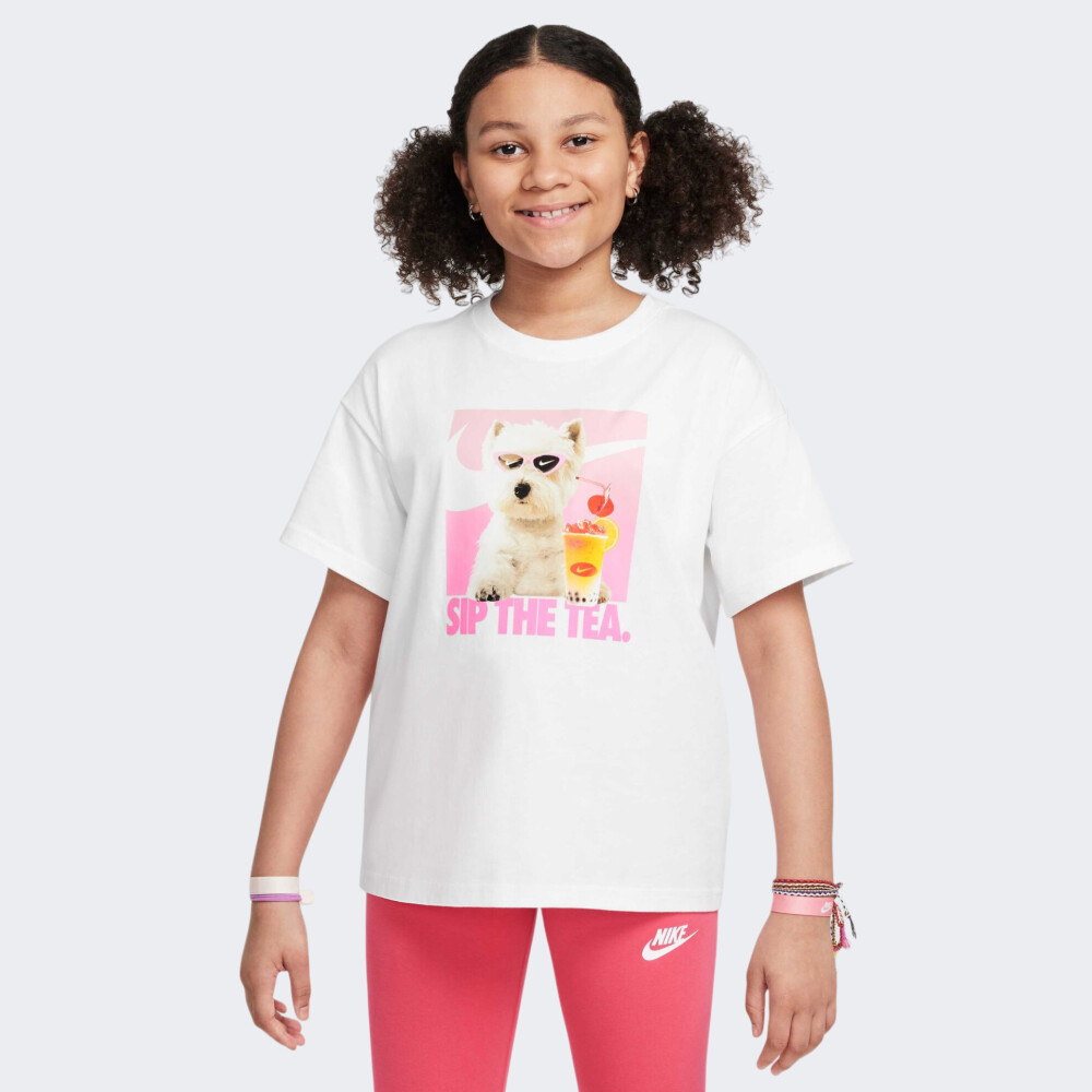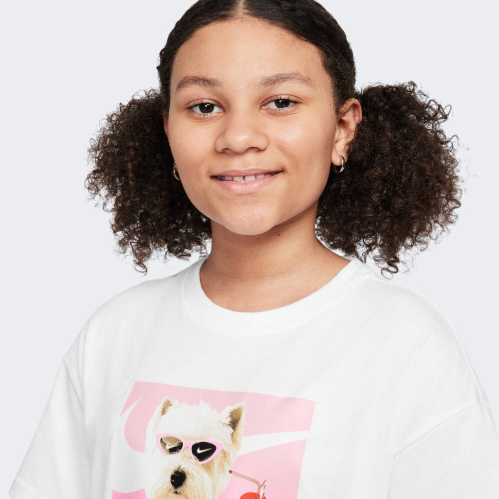 Футболка Nike G Nsw Photo Tee створена для тих дівчат, які хочуть, щоб кожен день був наповнений сонцем, легкістю та хорошим настроєм. Вона додає образу нотку літньої безтурботності й стане ідеальним вибором для прогулянок, подорожей або зустрічей із друзями. Модель виготовлена з м’якої бавовняної тканини, яка приємно лягає на тіло та дарує комфорт протягом усього дня. Вільний крій зі спущеними плечовими швами формує розслаблений, стильний силует, який не обмежує рухів, а навпаки — дозволяє впевнено танцювати, сміятись і рухатись у власному темпі. Круглий виріз горловини з м’якою внутрішньою вставкою дбайливо захищає шкіру від подразнень, навіть при тривалому носінні. Яскравий принт із милим песиком та прохолодним напоєм дарує позитивні емоції з першого погляду, заряджаючи настроєм літнього відпочинку. Футболка розроблена для дівчат віком від 7 до 15 років, які обожнюють модні речі з характером і хочуть виражати себе через стиль.