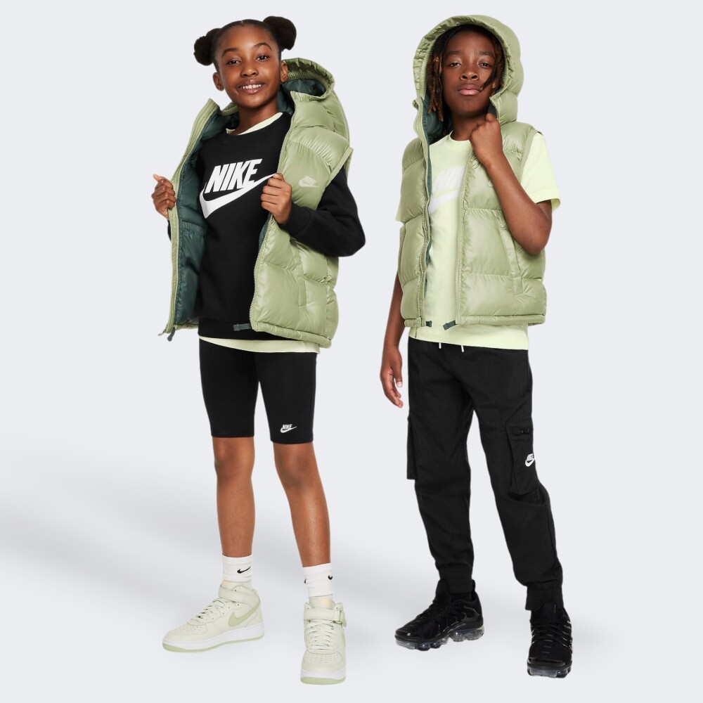 Куртка-жилет Nike K Nsw Tf Rpl Hgh Synfl Vest Ul - справжня знахідка для тепла та затишку у прохолодну погоду.Вона виготовлена з якісного матеріалу, який має водовідштовхувальне покриття для забезпечення сухості у вологу погоду. Therma-FIT й технологічний утеплювач Thermore надійно захищатимуть від пронизливого вітру та низьких температур. Вільний крій дозволятиме одягнути під низ теплу кофту, а шнурок знизу зберігатиме тепло. Капюшон та високий комір надаватимуть відчуття затишку, а блискавка по всій довжині полегшуватиме процес одягання. Кишені обшиті еластичною сітчастою тканиною сприятимуть безпечному зберіганню предметів без використання застібок. Куртка-жилет має лаконічний дизайн з невеликим логотипом, тому пасуватиме до різних повсякденних образів юного шанувальника бренду. Модель рекомендована для дітей віком від 7 до 15 років. Nike піклується про зниження впливу на довкілля, тому товар виготовлено по програмі Move to Zero, яка спрямована до нульового викиду вуглецю та нульових відходів, що допомагає захистити майбутнє.