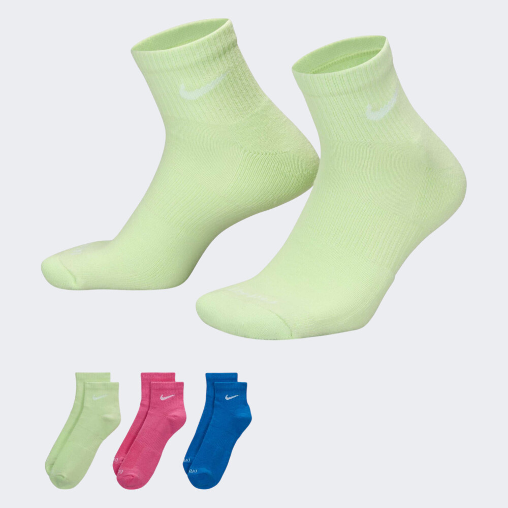 Набір шкарпеток Nike Everyday Plus Cushioned складається з трьох пар різних кольорів, що дозволяє легко комбінувати їх з улюбленим спортивним взуттям. Вони виготовлені з м’якого матеріалу, який дарує приємні відчуття та піклується про шкіру під час навантажень. Зонована вентиляція у верхній частині сприяє відведенню вологи, зберігаючи сухість та прохолоду навіть під час інтенсивних тренувань. Для ще більшого комфорту передбачена амортизація в зонах найбільшого тиску — під п’ятою та передньою частиною стопи, що знижує навантаження й додає впевненості у кожному кроці. Еластична смужка навколо арки стопи щільно охоплює ногу, що забезпечує підтримку, необхідну під час руху. Посилені п’ята та носок роблять модель витривалішою та довговічнішою — саме те, що потрібно для частих тренувань. А фірмовий логотип Nike додає стилю та вигідно виглядає у поєднанні з кросівками, демонструючи Вашу відданість спортивній естетиці бренду. Ці шкарпетки — це незамінний елемент для тих, хто тренується на повну, прагне комфорту в кожному русі й не готовий йти на компроміси у деталях.