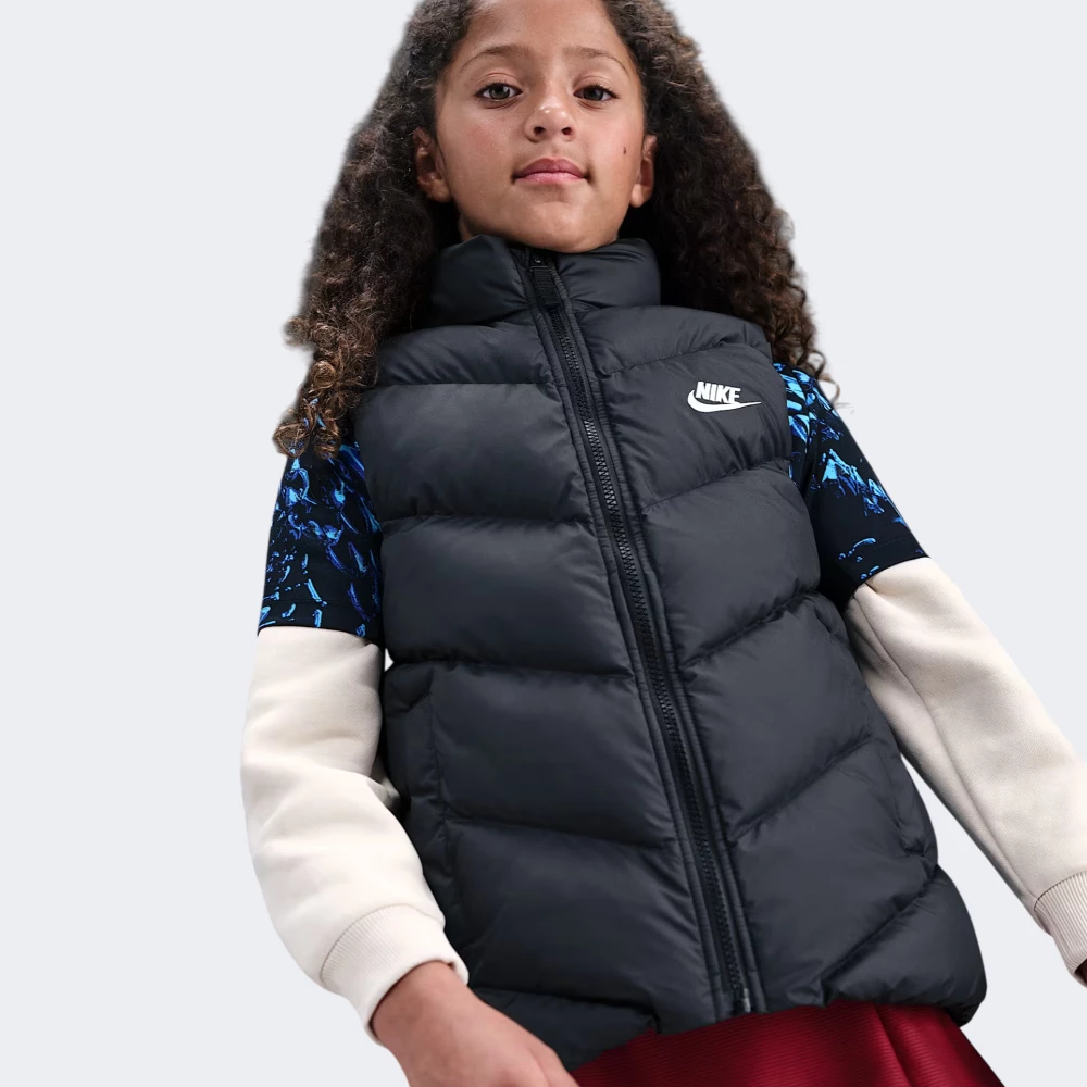 Куртка-жилет Nike K Nsw Tf Adp Puffer Vest натхненна культовими моделями Windrunner, що стали символом вуличної моди 80-х, тому дарує впевненість та стиль у будь-яку погоду. Вона виготовлена з гладкої тканини з водовідштовхувальним покриттям, тому захищає від легкого дощу та дозволяє залишатися активним навіть у прохолодні дні. Синтетичний утеплювач у поєднанні з технологією Nike Therma-FIT ефективно утримує природне тепло тіла, щоб жодна пригода не зупинилася через погоду. Вільний крій не сковує рухів, тому у ній зручно і на прогулянці, і під час активних ігор. Блискавка по всій довжині дозволяє легко регулювати комфорт, а бічні кишені вмістять корисні дрібнички, які варто завжди мати при собі. Завершує образ логотип Futura, який підкреслює любов до руху. Модель рекомендована для дітей віком від 7 до 15 років. Nike піклується про зниження впливу на довкілля, тому модель виготовлено по програмі Move to Zero, яка спрямована до нульового викиду вуглецю та нульових відходів.