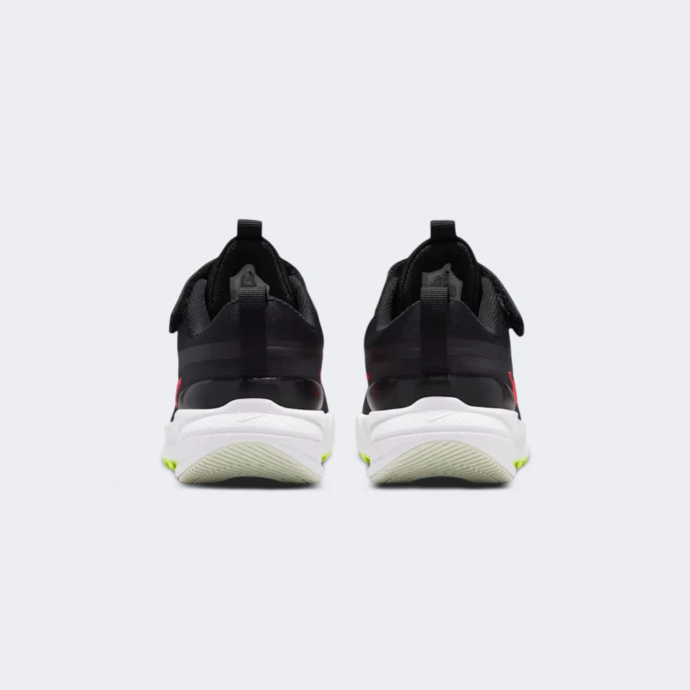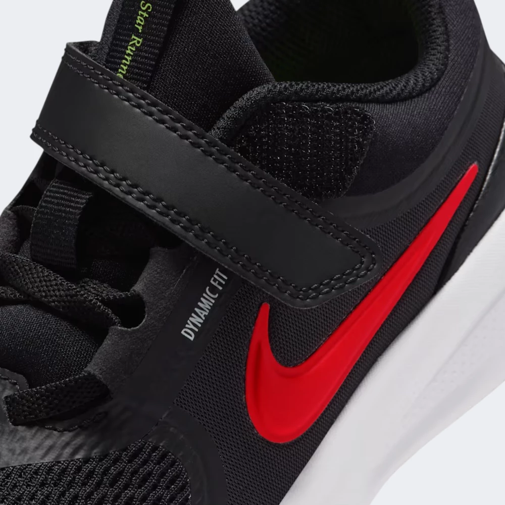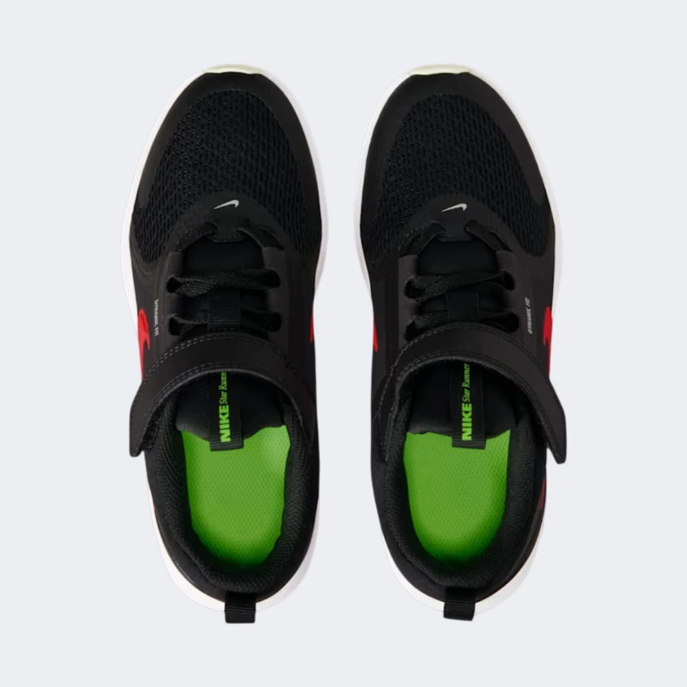 Nike STAR RUNNER 5 PS це кросівки з низьким профілем і комбінованим текстильно-синтетичним верхом, що включає дихаючу сітку в передній частині та матові синтетичні панелі по боках, зі шнурівкою та додатковою липучкою зверху і петельками на язичку та п'яті для зручного взування. Бічний великий логотип Swoosh яскраво-червоного кольору, проміжна підошва виконана з легкого спінованого матеріалу, зовнішня підметка з зносостійкої гуми з салатово-зеленими акцентами на протекторі, біла основна проміжна підошва, чорні шнурки і липучка. Матеріали верхньої частини комбіновані текстиль і синтетика, устілка та внутрішня підкладка текстильні з дихаючою структурою. Сезонність літній та демісезонний період