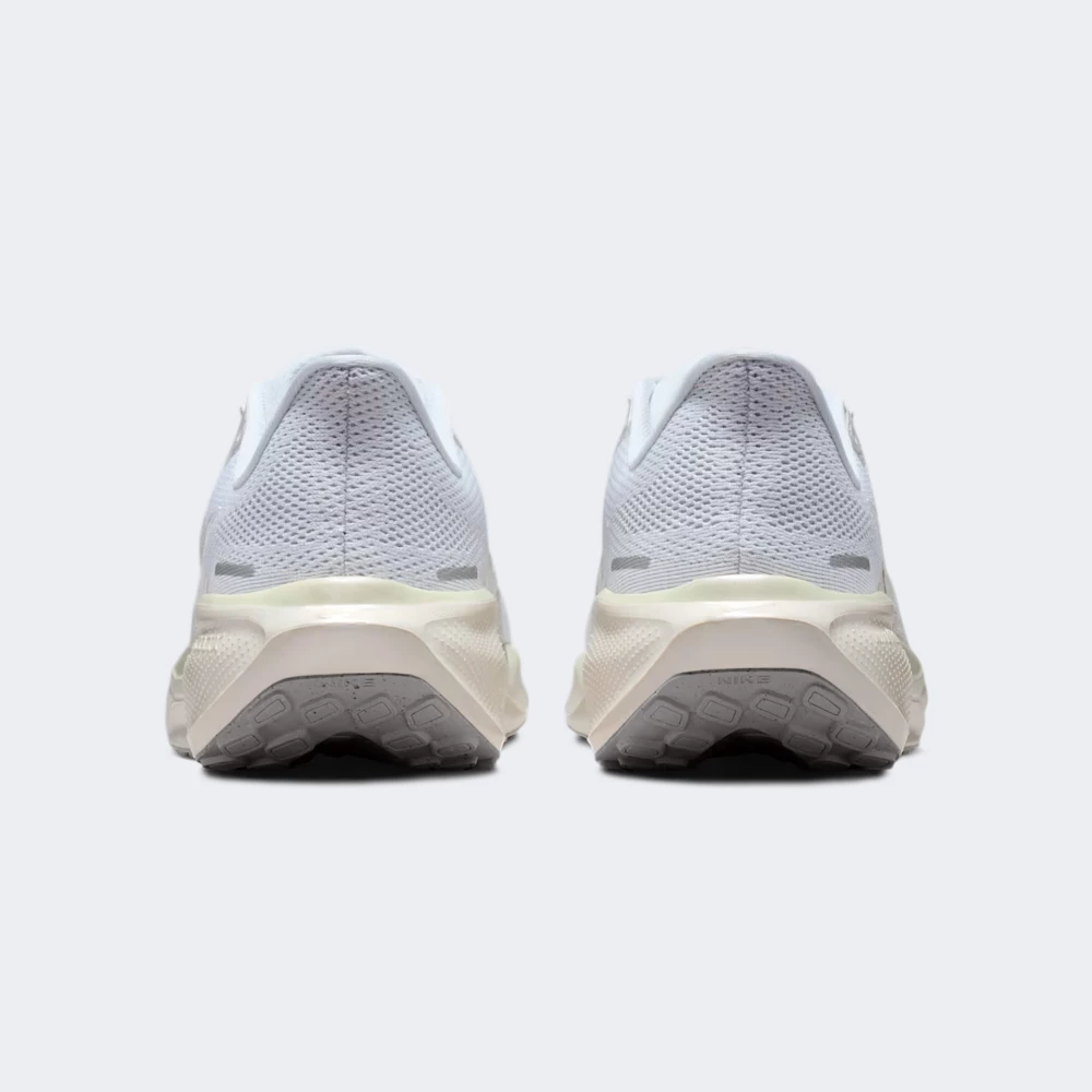 Nike W AIR ZOOM PEGASUS 41 ESS це бігові кросівки з сітчастим верхом білого кольору і білим логотипом Swoosh, зі шнурівкою і м’яким коміром у задній частині. Мультитекстильна конструкція верху має синтетичні підсилення в зонах шнурівки та п’яти і гладкі шви всередині. Проміжна підошва виконана з легкого спіненого EVA-подібного матеріалу кремово-бежевого відтінку з тонкою повітряною камерою Air Zoom, зовнішній гумовий протектор пофарбований у сірий та має виступаючий вафельний малюнок. Є устілка анатомічної форми з м’якою поверхнею, рефлекторні акценти світло-сірого кольору, язичок оптимально лягає на підйом стопи. Сезонність літня і демісезонна. Матеріали тканина сітка, синтетичні підсилення, спінений проміжний шар EVA-подібний, гумовий протектор