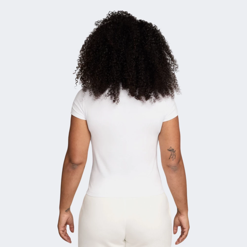 Nike W NSW SS TEE IWD PHOTO — жіноча футболка для щоденного комфорту у теплу пору. Поєднання бавовни, модалу та спандексу дарує приємну м’якість на дотик, дихає та еластично лягає по фігурі. Приталений укорочений крій підкреслює талію, не обмежує рухів і створює легкий силует на літо. Короткі рукави й акуратна U-подібна горловина з м’яким кантом забезпечують комфорт без подразнень протягом дня. Білий колір підкреслює свіжість образу, а центральний прямокутний принт із блакитними та контрастними темними акцентами додає характеру. Фірмовий логотип у композиції принта підкреслює приналежність до Nike і доповнює чистий мінімалістичний дизайн.