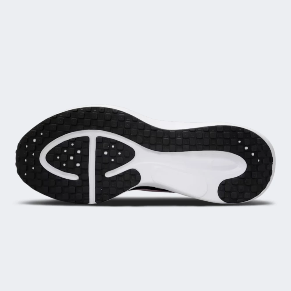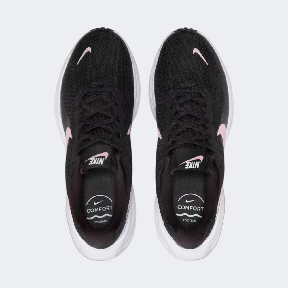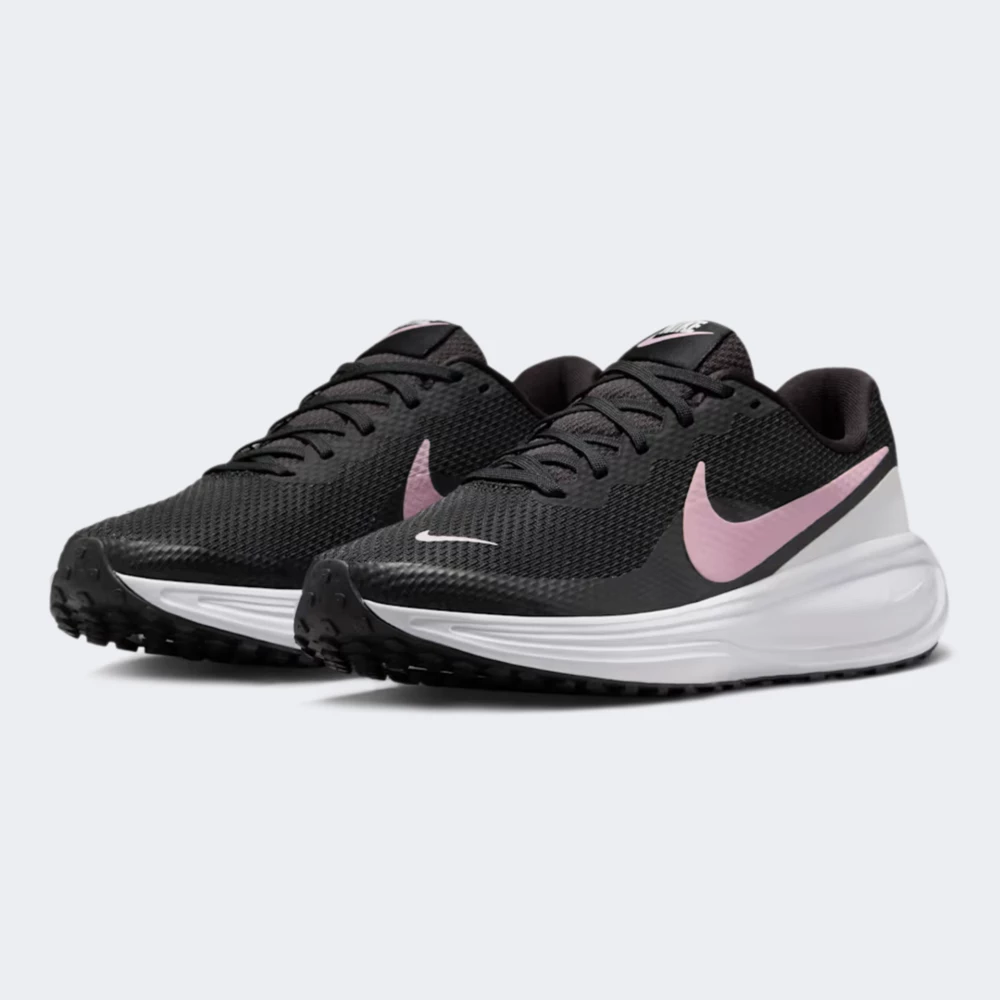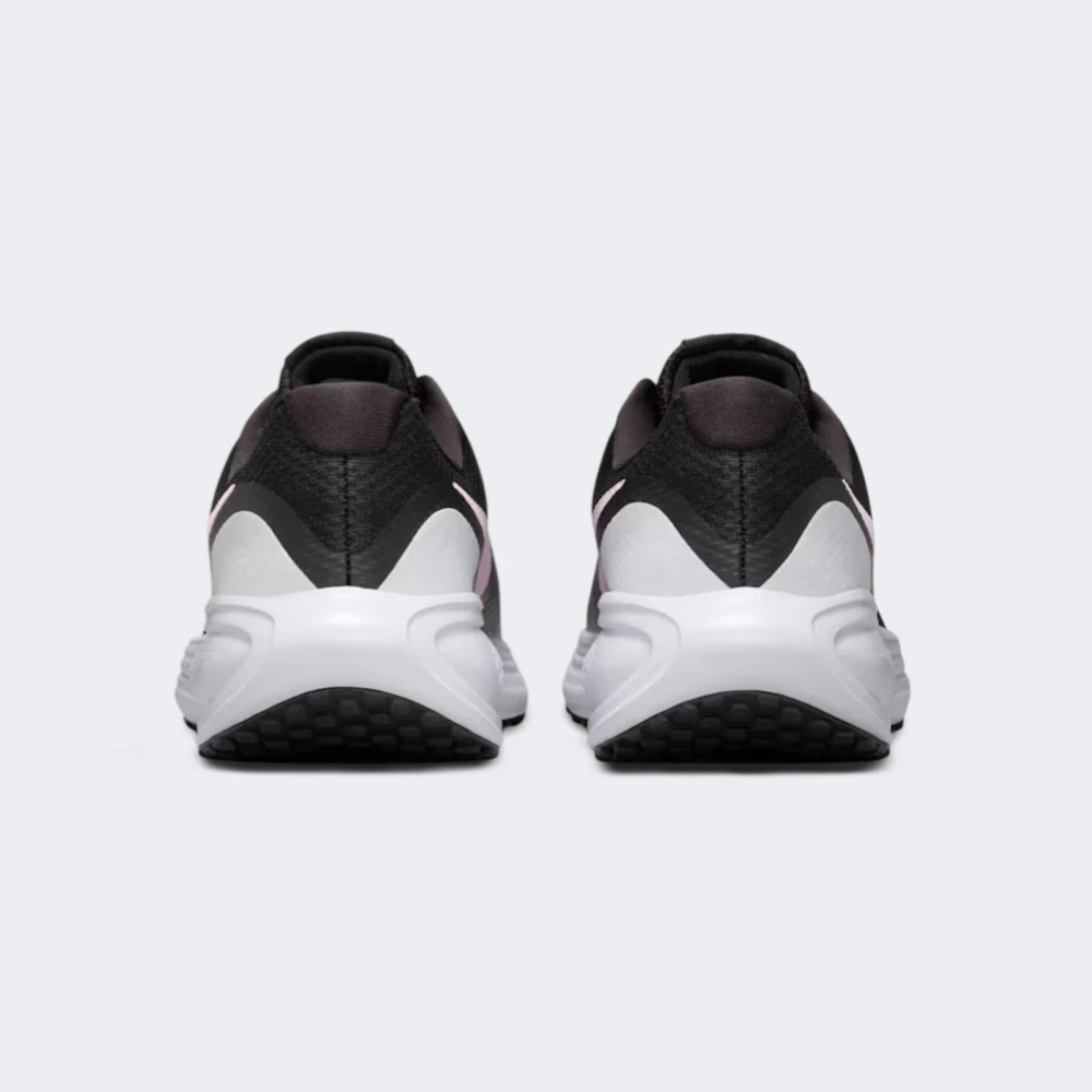 Nike W REVOLUTION 8 кросівки з сітчастим верхом у чорному відтінку з синтетичними підкріпленнями на п’яті та носковій зоні і великим боковим Swoosh пастельно-рожевого кольору та білим мінімальним Swoosh на носку. Класична центральна шнурівка, м’який комір у задній частині і язичок з білим логотипом; внутрішні гладкі шви. Біла спінена середня підошва з виразними канавками гнучкості і чорним гумовим протектором на підметці. Склад верху текстильний сітчастий з синтетичними накладками, мідсол спінений матеріал, підметка зносостійка гумa. Сезонність літo, демісезон.