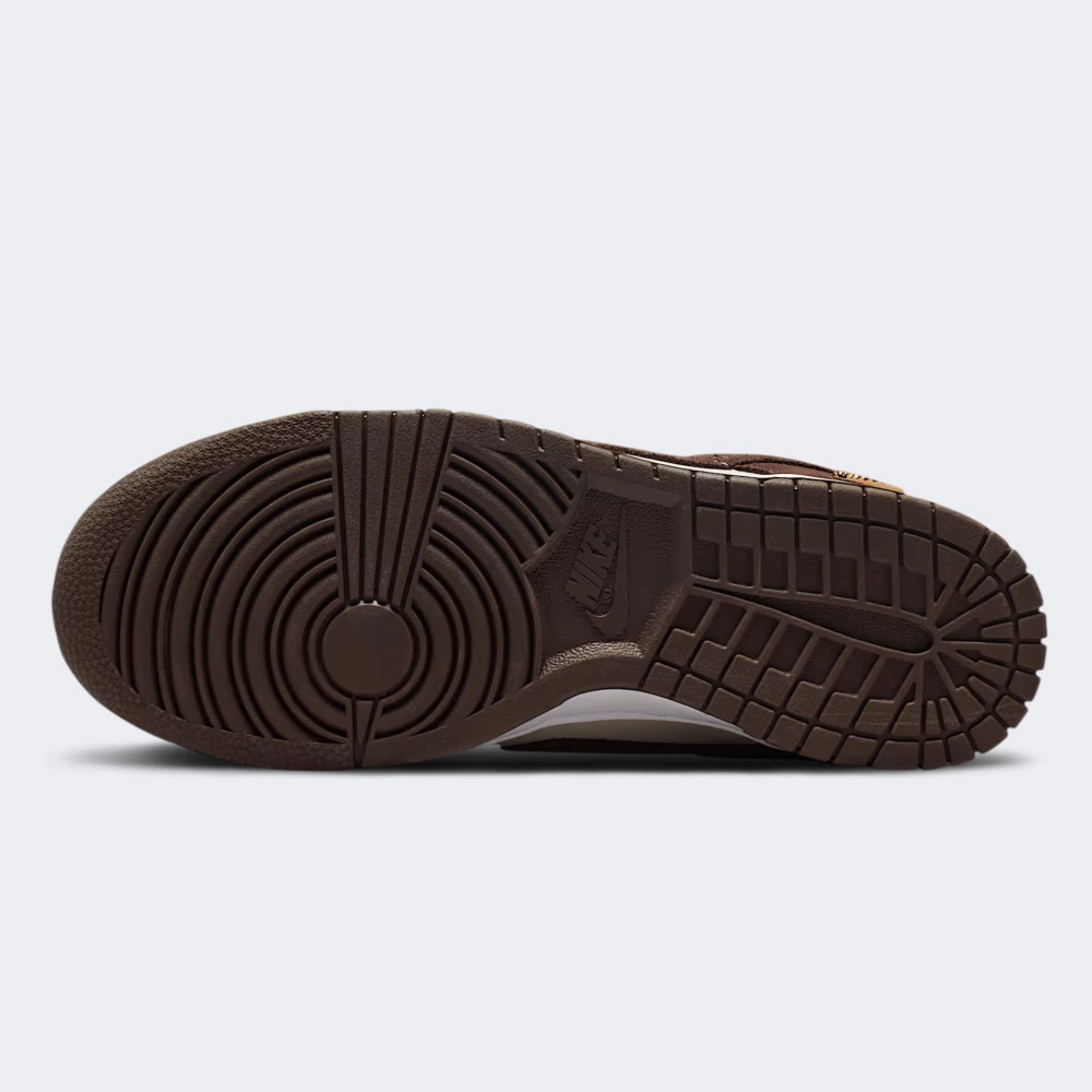 WMNS DUNK LOW SE кеди в низькому силуеті з класичною центральною шнурівкою, перфорованим носком і підсиленими коричневими замшевими накладками на носку та п’яті. Великий Swoosh у коричневому замшевому відтінку розташований по боках, на бічній панелі присутній невеликий золотисто-жовтий акцент Swoosh, шнурівка коричнева, язичок і підкладка світло-кремові з коричневими логотипами. Плоска гумова підошва складається з білого/кремового мідлесола і коричневого протектора, всередині дихаюча підкладка і устілка, м’який комір у п’ятковій частині і класична анатомічна колодка Dunk. Кольори білий, коричневий, жовтий. Матеріали верхньої частини комбіновані шкіра і замша/синтетика. Сезонність демісезонна.