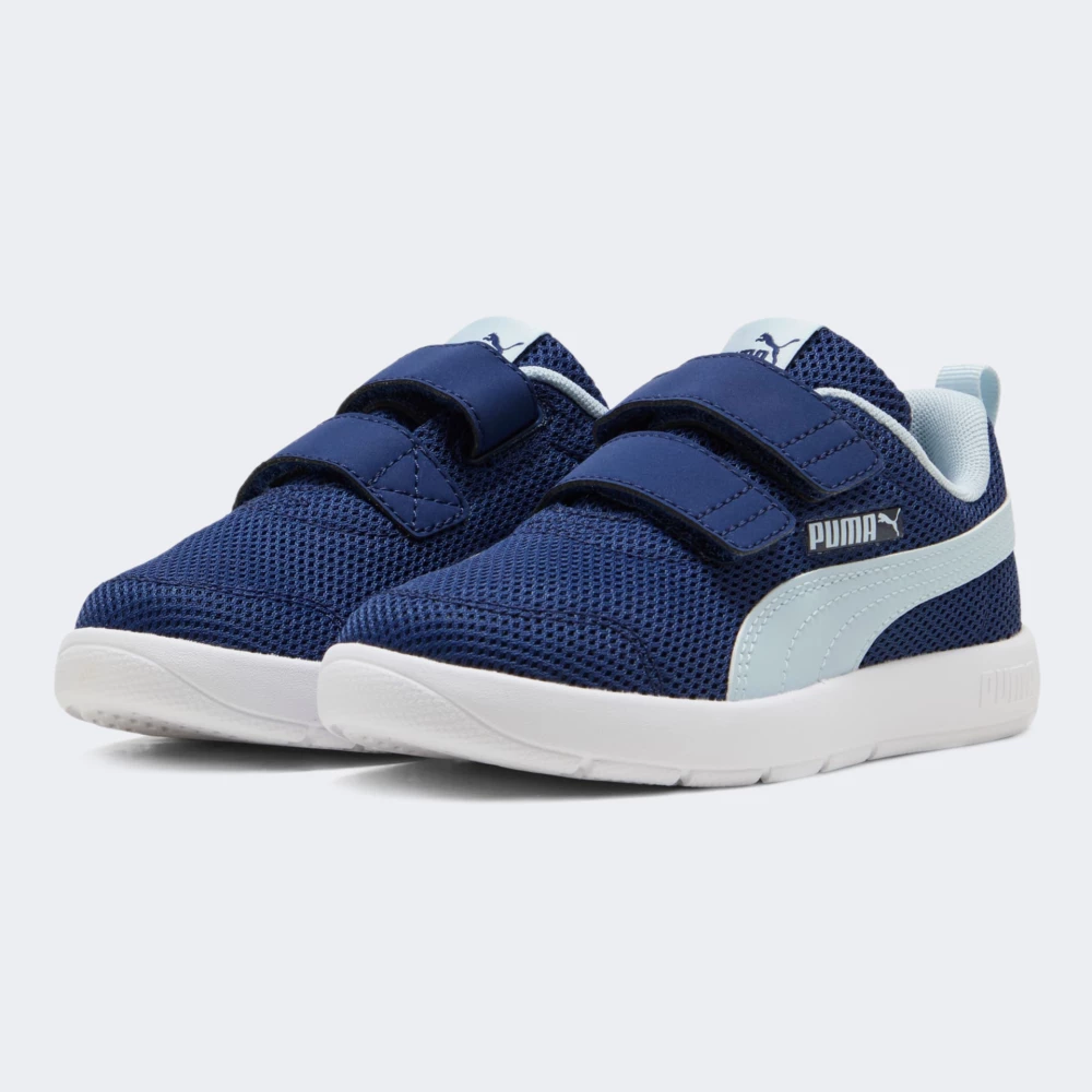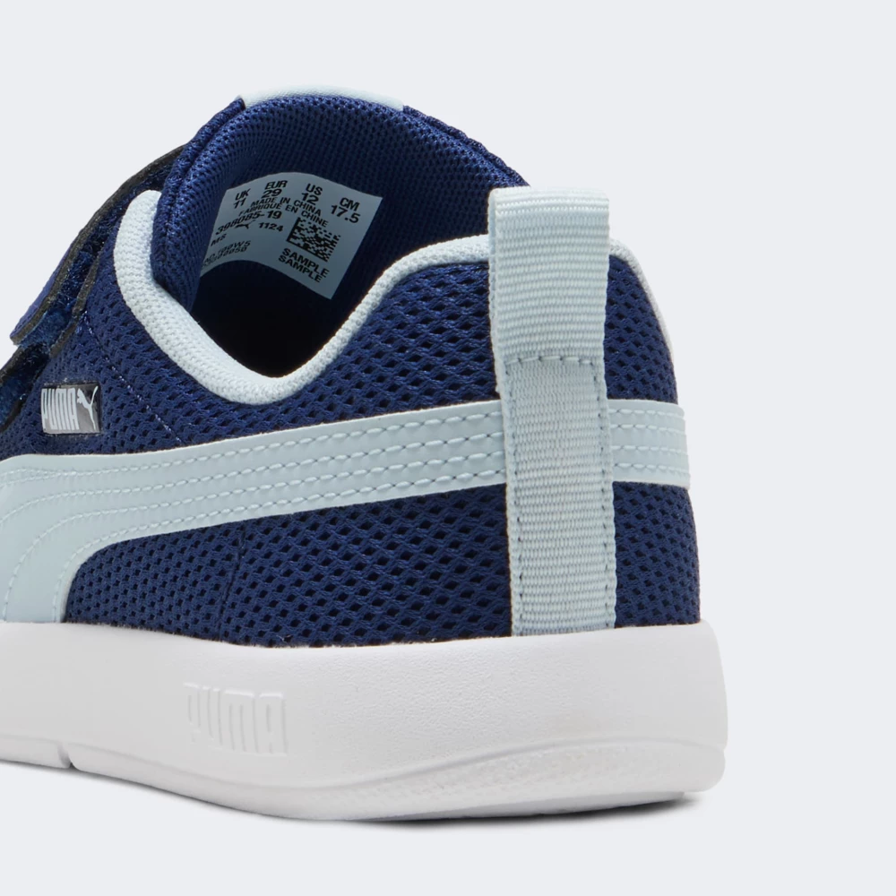 Puma Courtflex V3 Mesh PS — легкі дитячі кеди для щоденних прогулянок і активних ігор. Дихаючий сітчастий верх із синтетичними елементами допомагає підтримувати комфортний мікроклімат всередині взуття та спрощує догляд. Дві липучки замість шнурівки забезпечують надійну фіксацію й дозволяють легко взувати пару, а м’який язичок знижує тиск у зоні підйому. Гнучка підошва з EVA дарує легкість кроку, базову амортизацію та плавний перекат стопи протягом дня. Біла підошва контрастує з темно-синім верхом, а світло-блакитна смуга й логотип PUMA підкреслюють фірмовий стиль бренду. Петля на п’яті допомагає швидко взутися, що особливо зручно у щоденному ритмі дитини. Модель створена для літа та демісезону — коли потрібні повітропроникність, комфорт і невимушений спортивний образ.
