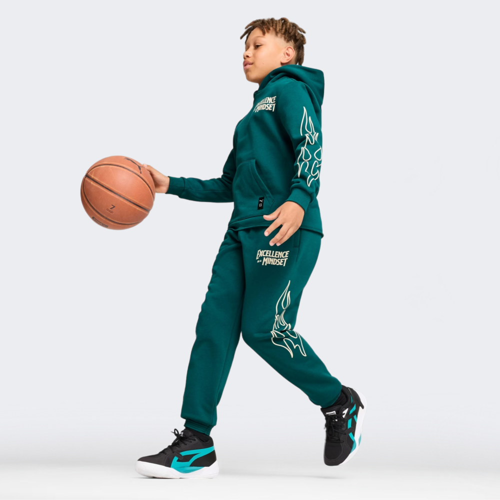 Спортивні штани Puma Basketball Caution Sweat Pants B дозволять юному баскетболісту продовжити свої тренування навіть у прохолодну погоду. Вони виготовлені з флісової тканини, яка відмінно утримує тепло, допомагаючи зігрітись. Вільний крій із тонкими манжетами знизу штанин не сковуватиме дитячих рухів, а еластичний пояс покращуватиме фіксацію. Бічні кишені дозволять мати при собі корисні дрібнички. Спортивні штани декоровані оригінальним принтом та написом, що додаватиме дитячим образам неймовірного стилю. Модель рекомендована для дітей віком від 8 до 16 років. Puma піклується про зниження впливу на довкілля, тому матеріал виробу містить щонайменше 30% перероблених волокон, що є одним з кроків до кращого майбутнього.