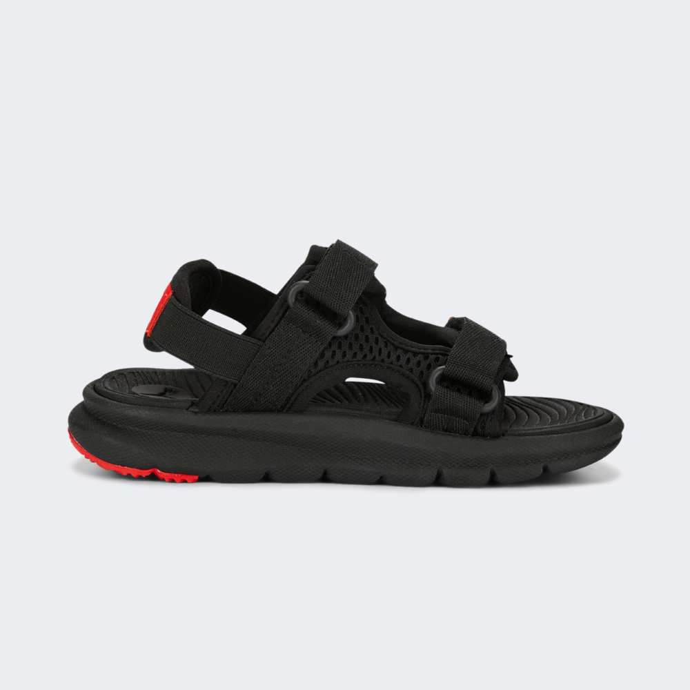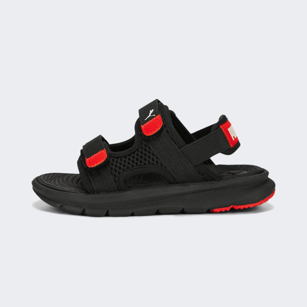 Сандалі Puma Evolve Sandal Ps — ідеальний супутник для літніх пригод, який подарує Вашій дитині максимум зручності, впевненості та радості від кожного кроку. Верх виготовлено з міцного текстилю у поєднанні з сіткою, що забезпечує надійну фіксацію ніжки та оптимальний повітрообмін. Маленькі ніжки залишатимуться в комфорті навіть у найспекотніші дні. Конструкція моделі передбачає еластичний ремінець із м’якою накладкою на п’яті та ремінці з липучками, завдяки чому дитина зможе легко взувати або знімати взуття самостійно. Проміжна підошва з м’якої піни дарує кожному кроку легкість і пружність, а анатомічна устілка дбайливо підтримує природне положення стопи, сприяючи правильному розвитку ходи. Гумова підметка з рельєфним малюнком гарантує впевнене зчеплення на будь-якій поверхні — від тротуарної плитки до дитячого майданчика. Яскраві червоні елементи на ремінцях і підошві додають дизайну динамічності та характеру. А логотипи Puma виступають стильним акцентом, що підкреслює любов до активного способу життя та сучасної дитячої моди. Модель рекомендовано для дітей віком від 4 до 8 років, які завжди в русі та відкриті до нових вражень.