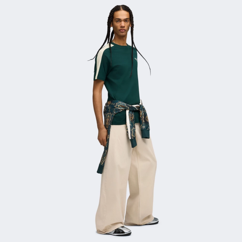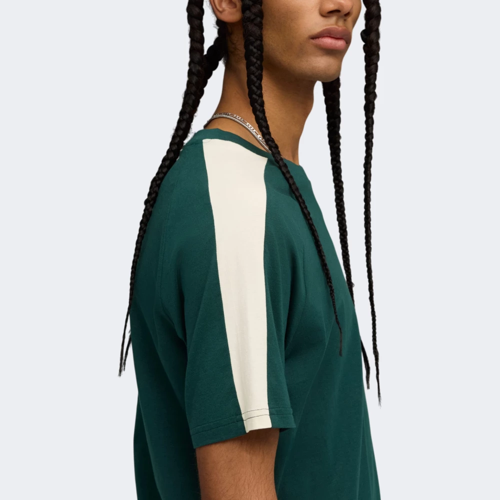 Колекція Puma T7 – це повернення до легендарного стилю, який підкорив вуличну моду завдяки своїм знаковим 7-сантиметровим фірмовим смужкам. Вона стала улюбленою серед тих, хто цінує гармонію спорту та вуличної естетики. Футболка Puma T7 Tee створена для тих, хто прагне привертати увагу. Вона виготовлена з м’якої бавовняної тканини, тому дарує приємні тактильні відчуття та комфорт, який залишається з Вами у ритмі цілого дня — хай то прогулянка, зустріч із друзями чи спонтанна пригода. Класичний крій з рукавами реглан формує сучасний, впевнений силует, який не сковує рухів й дозволяє залишатися активним у будь-якій ситуації. А кругла горловина з м’якою стрічкою зсередини захищає шкіру від подразнення, тож ніщо не відвертатиме уваги від важливого. На глибокому зеленому фоні футболки контрастні світлі смужки на рукавах і логотип Puma створюють яскравий акцент — це не просто деталі, це візуальне підтвердження Вашого вибору на користь стилю з характером. Puma піклується про зниження впливу на довкілля, тому модель щонайменше на 20% виготовлено з переробленої бавовни.