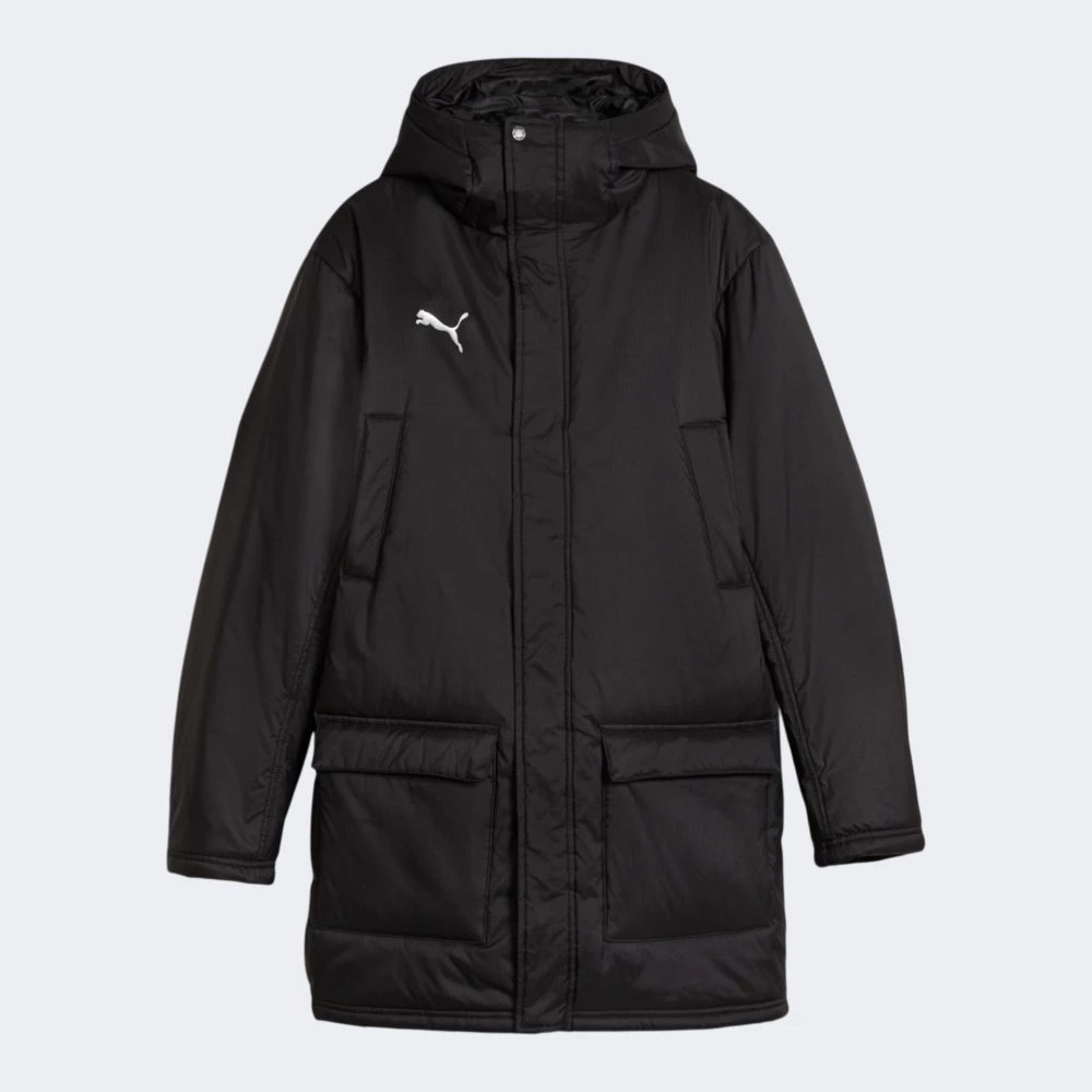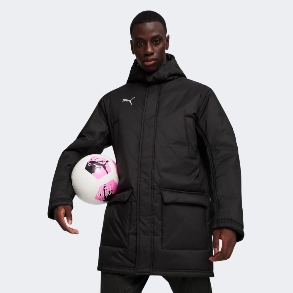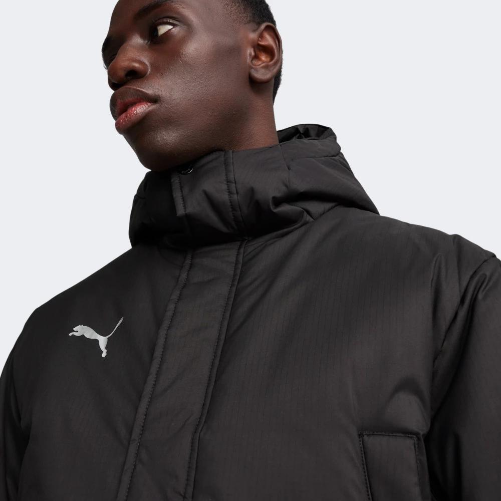 Куртка Puma teamFinal Winter Jacket створена для того, щоб Ви відчували себе затишно, відправляючись на улюблені тренування з футболу. Вона має зовнішній шар із якісних матеріалів та синтетичний утеплювач, що у поєднанні з технологією warmCELL ефективно утримує тепло, забезпечуючи відчуття затишку з першої хвилини перебування на вулиці чи футбольному полі. Подовжений крій надає додатковий захист від холоду та вітру, а капюшон, високий комір і штормовий клапан на кнопках поверх блискавки створюють максимальний комфорт за будь-якої погоди. Практичні кишені дозволяють зручно зберігати необхідні дрібниці або просто зігріти руки. Лаконічний логотип Puma підкреслює спортивний характер образу та сучасну естетику бренду, демонструючи Вашу відданість активному способу життя і любов до футболу. Puma піклується про зниження впливу на довкілля, тому модель виготовлено з використанням перероблених матеріалів.