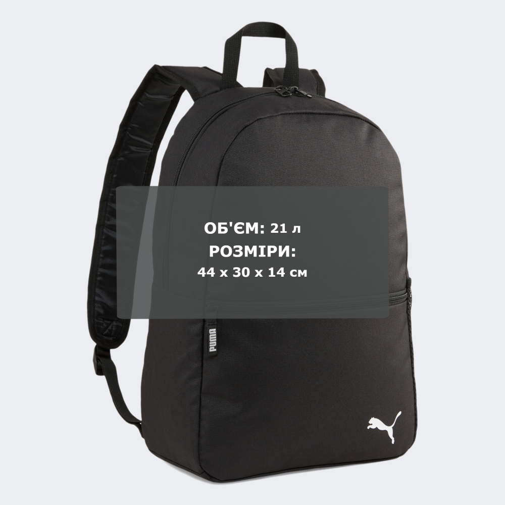 Рюкзак Puma teamGoal Backpack Core дозволить Вам завжди бути готовим до будь-якої ситуації як на полі, так і на трибунах. Він виготовлений зі зносостійкого матеріалу, який витримуватиме інтенсивне використання та легко очищується: забруднення достатньо просто протерти вологою тканиною. Просторе основне відділення дозволить зручно організувати необхідні Вам речі, тоді як передня кишеня на блискавці забезпечуватиме швидкий доступ до дрібничок, які завжди мають бути під рукою. Бічна сітчаста кишеня призначена для пляшки з водою, щоб Ви могли втамування спраги навіть у русі. М'які регульовані плечові ремені розроблені для індивідуальної посадки, тому даруватимуть максимальний комфорт навіть при тривалому носінні. Рюкзак декоровано невеликим логотипом, який додаватиме стильного акценту та підкреслюватиме Вашу відданість легендарному бренду. Puma піклується про зниження впливу на довкілля, тому модель виготовлено з використанням перероблених матеріалів.