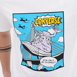Футболка Converse Shoe Hero Tee стане стильним завершенням Ваших повсякденних образів для теплої погоди. Вона виготовлена з бавовняної тканини, яка є приємною до тіла та надає відчуття природності. Класичний крій не сковуватиме Ваших рухів, а кругла горловина запобігатиме подразненню шкіри. Футболка декорована графічним принтом, натхненним ретро-коміксами, який зображає яскраве зображення кедів Converse Chucks розміру монстра. Друк нанесено гнучким гумовим чорнилом, що робить його стійким до зношування.