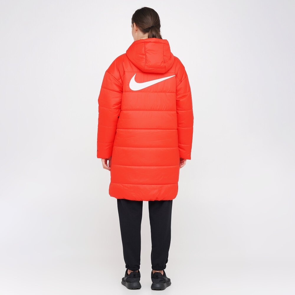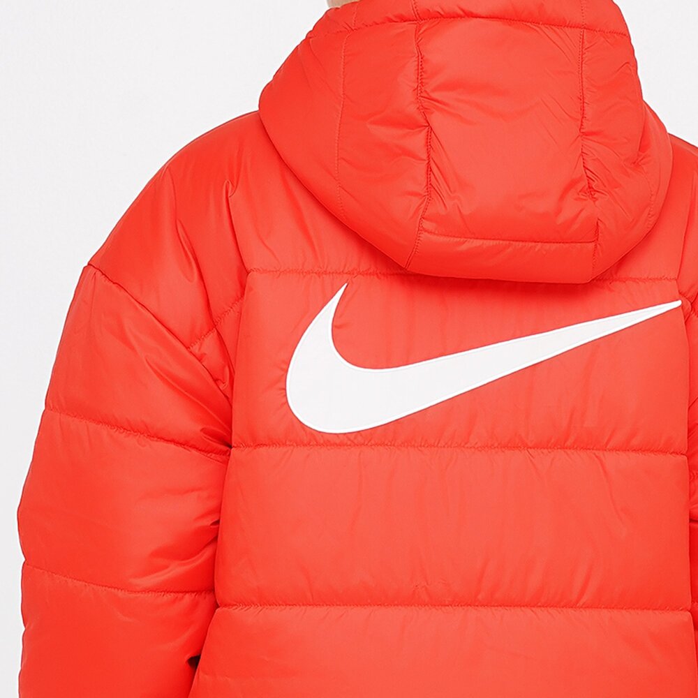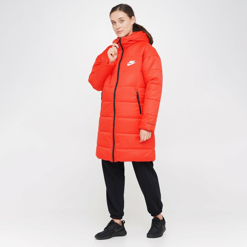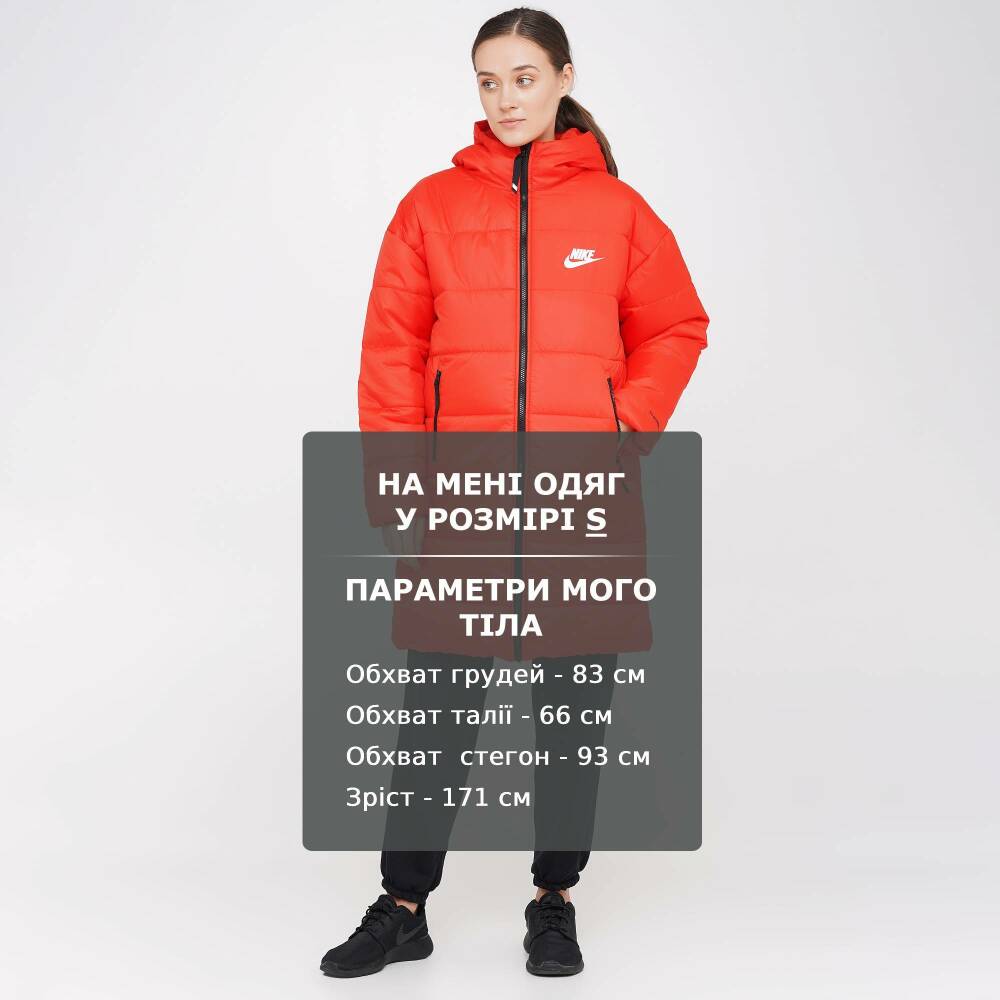 Куртка утеплена, прямого крою та контрастного кольору. Логотип бренду Nike на грудях. Капюшон вшитий. Кишені прорізні. Довжина виробу по спинці на розмір М: 90 см, довжина рукава 53 см.